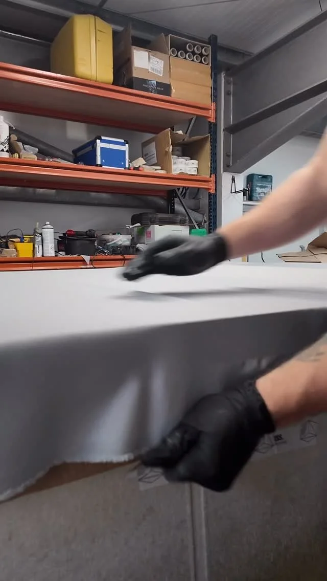 4. Using heat or tension (depending on the system), the fabric is stretched taut and clipped into the perimeter frame.